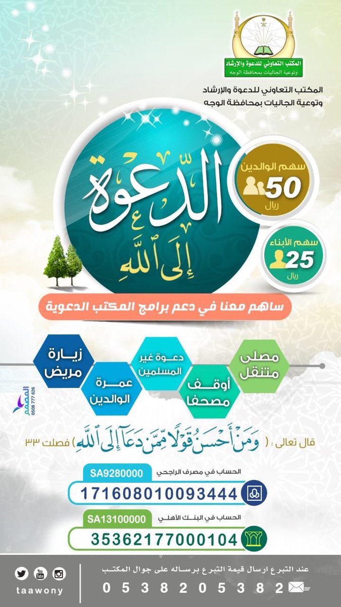 الصدقة ودائع الآخرة على تويتر مشروع دعم مشاريع مكتب الدعوة قيمة السهم 25 ريال أو تبرع بأي مبلغ تجود به الدال على الخير كفاعله Taawony