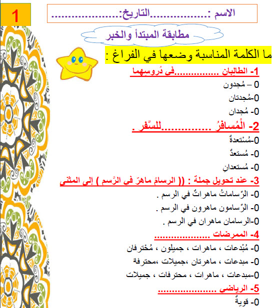 ورقة عمل المبتدأ والخبر للصف الرابع
