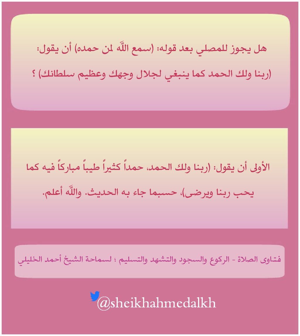 محبو الشيخ أحمد الخليلي On Twitter هل يجوز للمصلي بعد قوله سمع الله لمن حمده أن يقول ربنا ول ك الحمد كما ينبغي لجلال وجهك وعظيم سلطانك الشيخ أحمد الخليلي Https T Co E1dbjedmhs