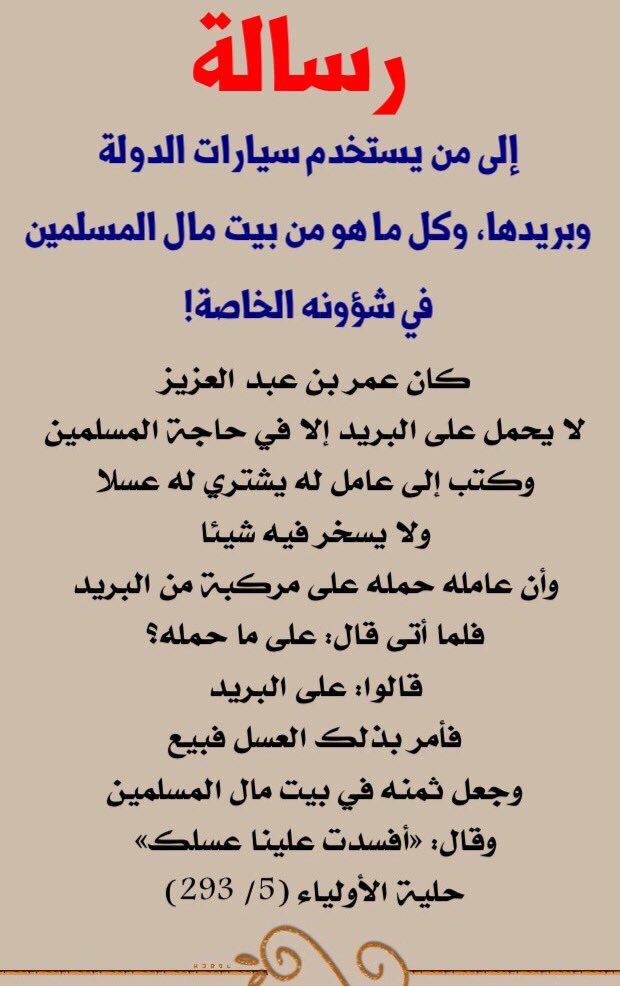 د بدر بن علي العتيبي On Twitter وكان عند عمر بن عبدالعزيز سراجان فما كان من بيت مال المسلمين أسرج له في حوائج المسلمين وإذا فرغ أطفأة وأسرج عليه سراجه الحلية 5