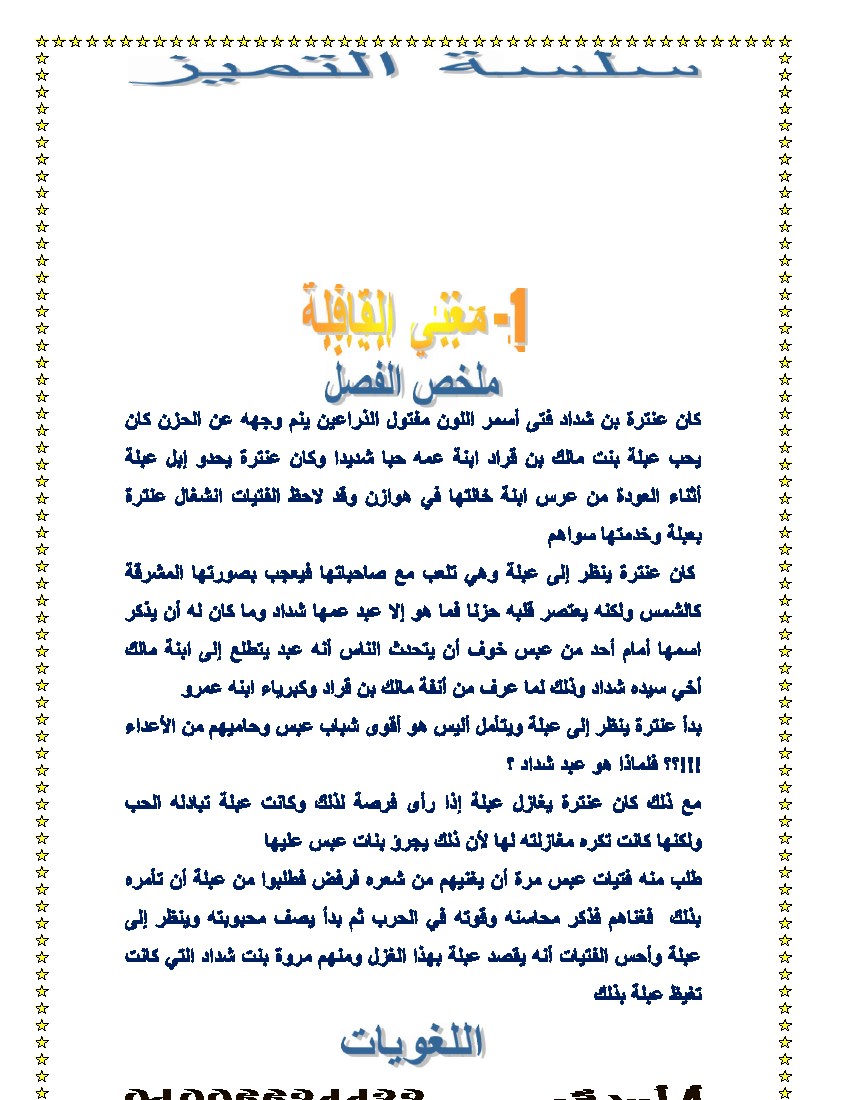 لغة عربية أولي ثانوي ت2 ملزمة عنترة بن شداد القصة المقررة علي اولي ثانوي ترم ثاني