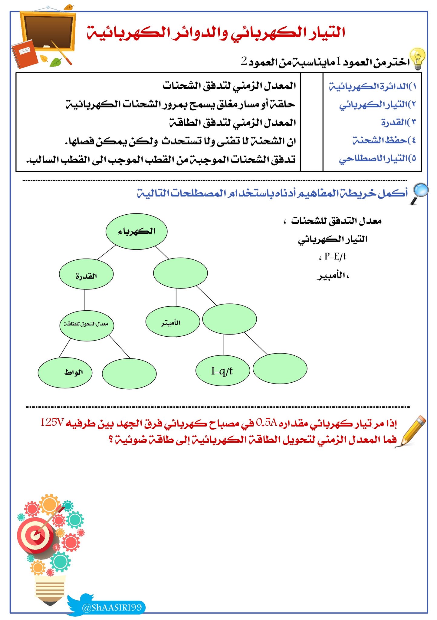 ورقة عمل الدرس الاول التيار الكهربائي